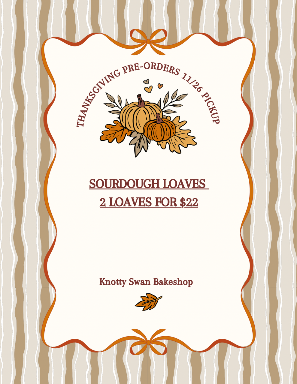 Crusty on the outside, soft and tangy on the inside—our handcrafted sourdough loaves are the perfect addition to your Thanksgiving table.